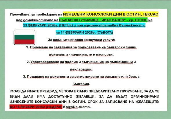 Проучване за провеждане на изнесени консулски дни в Остин, Тексас, под домакинството на БУ „Иван Вазов“ –...